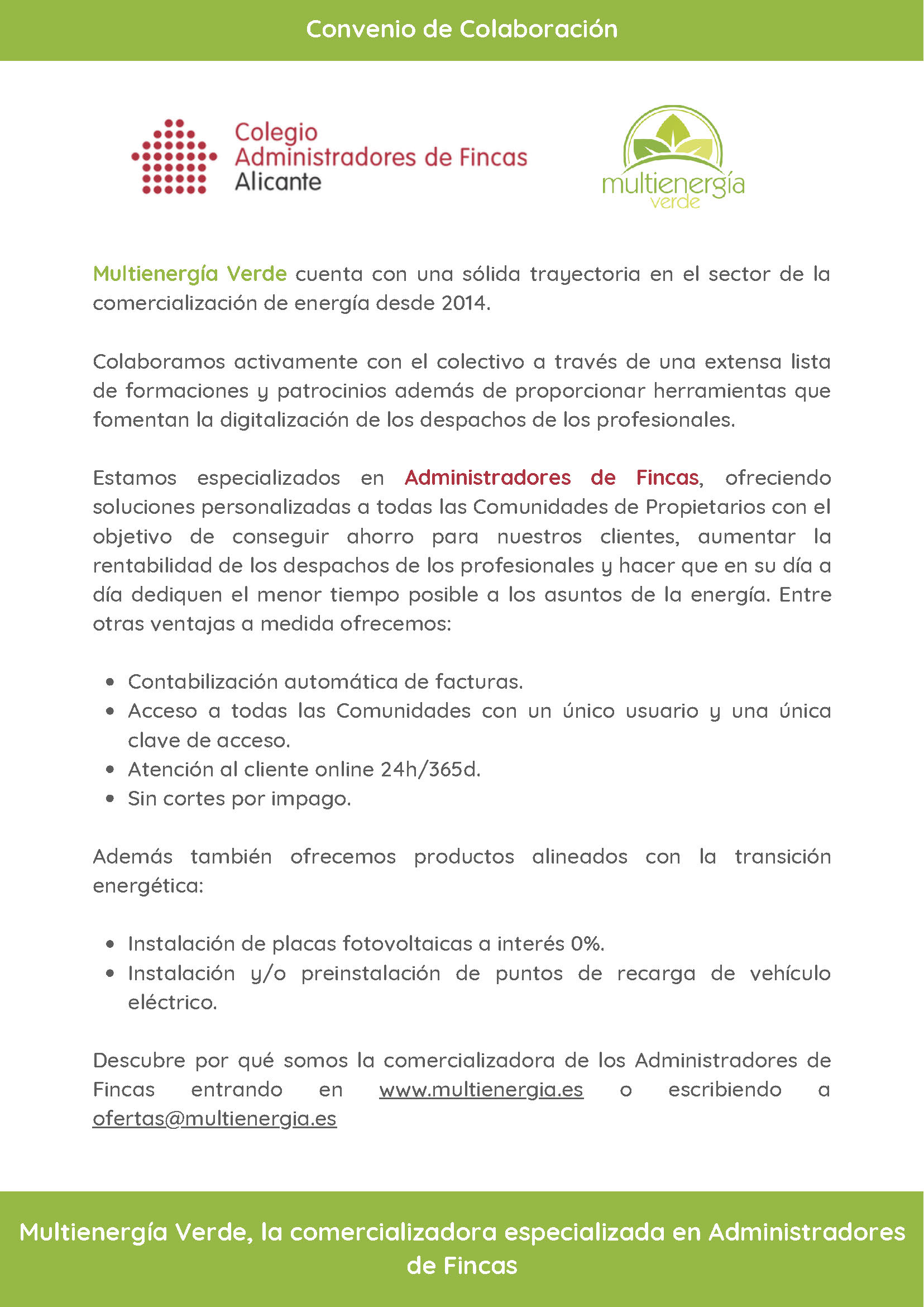 Hace unos días firmamos acuerdo de colaboración con la empresa Multienergía Verde. Es una comercializadora de energía muy vinculada, a nivel nacional, con los Administradores de Fincas colegiados. Si queréis saber más sobre todos sus productos, seguir este enlace: www.multienergia.es