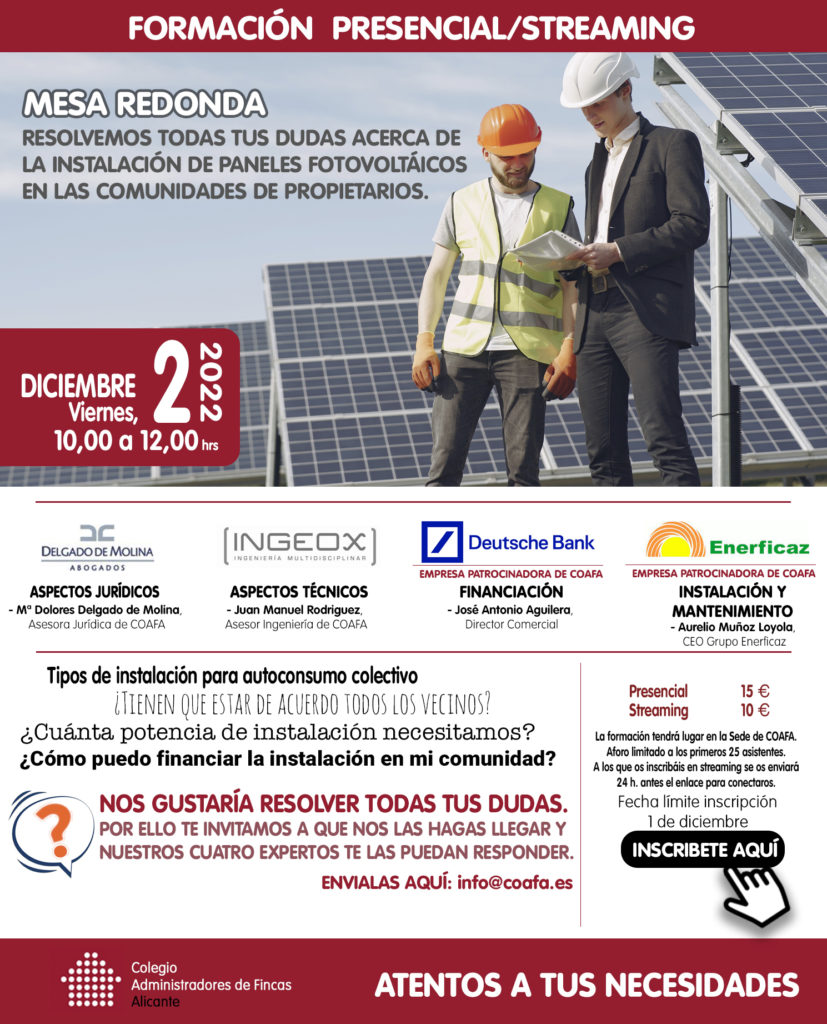 Todo lo que necesitas saber sobre la instalación de paneles fotovoltaicos en las Comunidades de propietarios. Enlace inscripción: https://tpv.coafa.es/index.php?curso=40