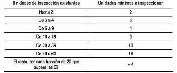 Elementos de inspección por muestreo: se inspeccionarán las unidades mínimas de inspección en función del número de unidades de que disponga el edificio.