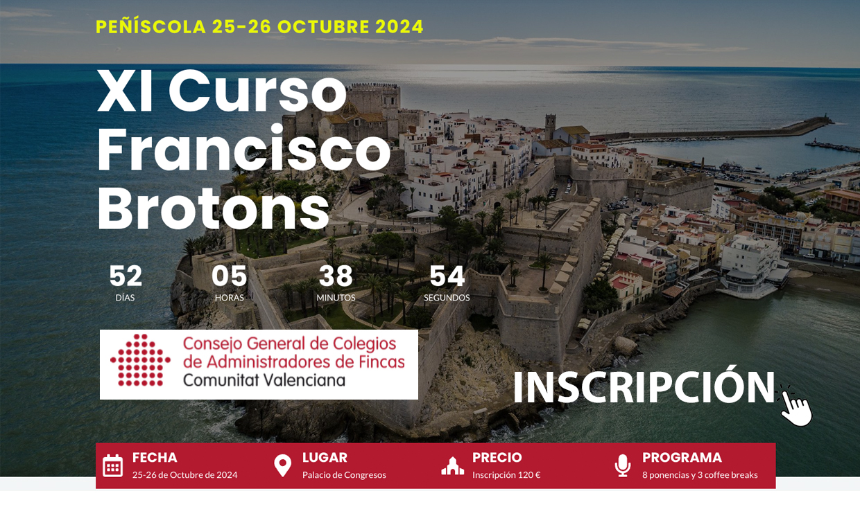 Edición 2024 del Curso Francisco Brotons para AAFF Colegiados que este año se celebrará en el Palacio de Congresos de la espectacular ciudad de Peñíscola en Castellón.